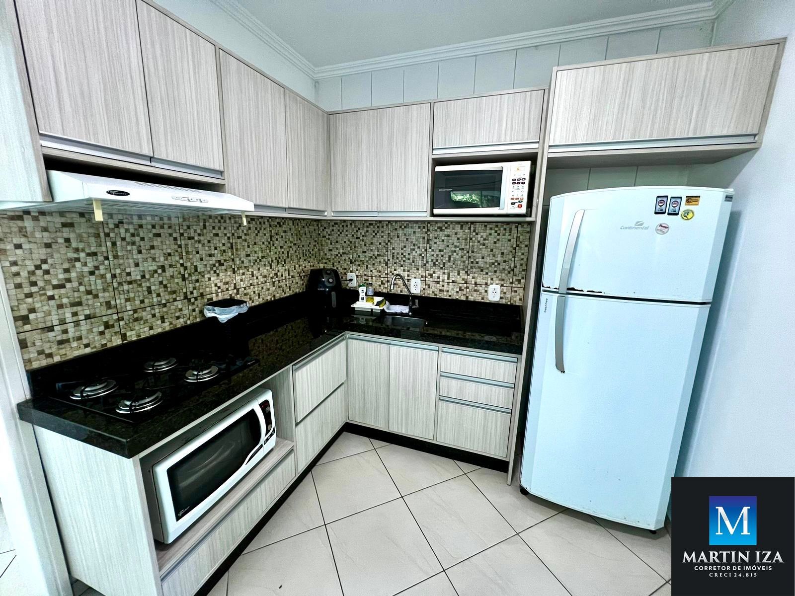 - Cozinha com móveis sob medida, cooktop, forno elétrico, geladeira e utensílios básicos.