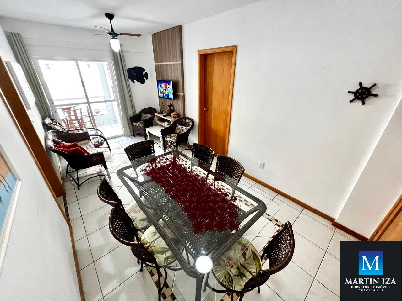 -Sala de estar/jantar com mesa para 6 pessoas, TV e sofá.