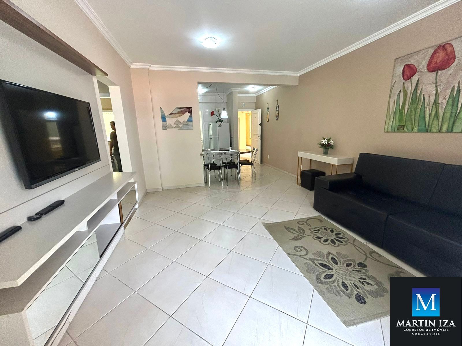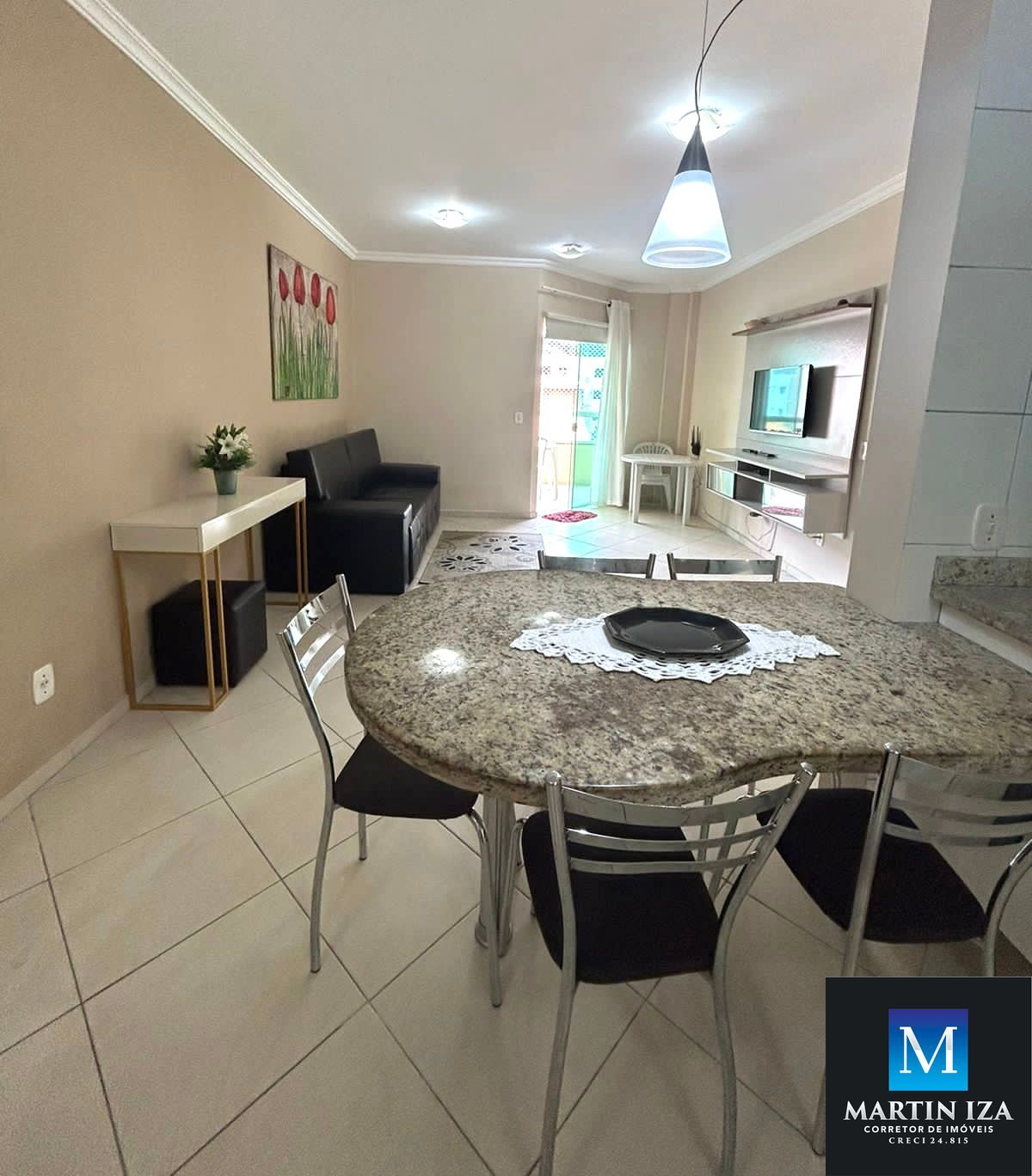 -Sala de estar/ jantar, com mesa para 5 pessoas, sofá e TV.