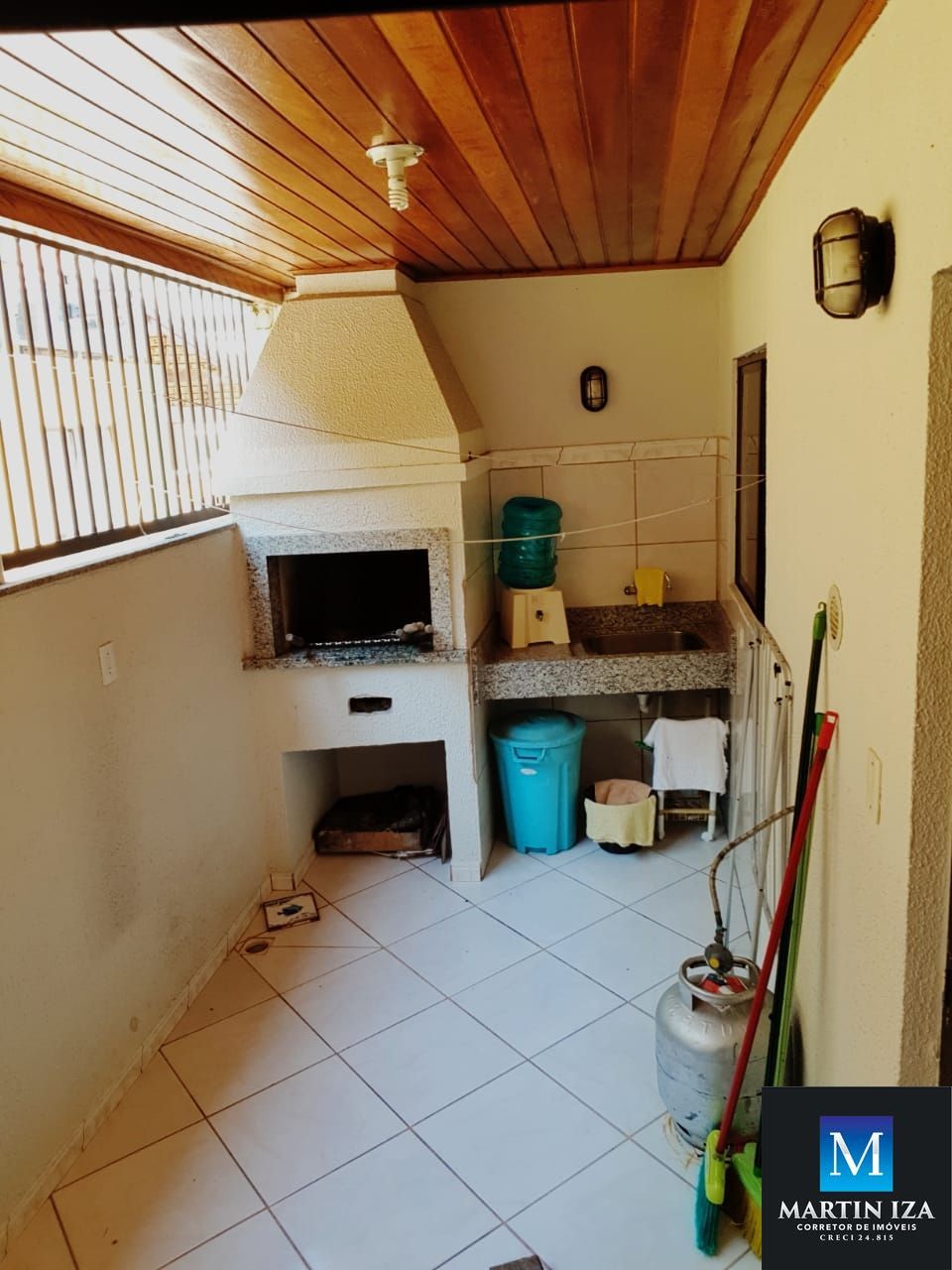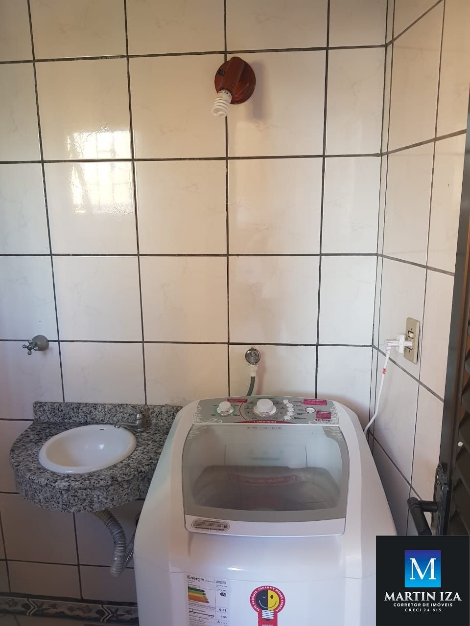 -Churrasqueira e área de serviço com máquina de lavar roupas.