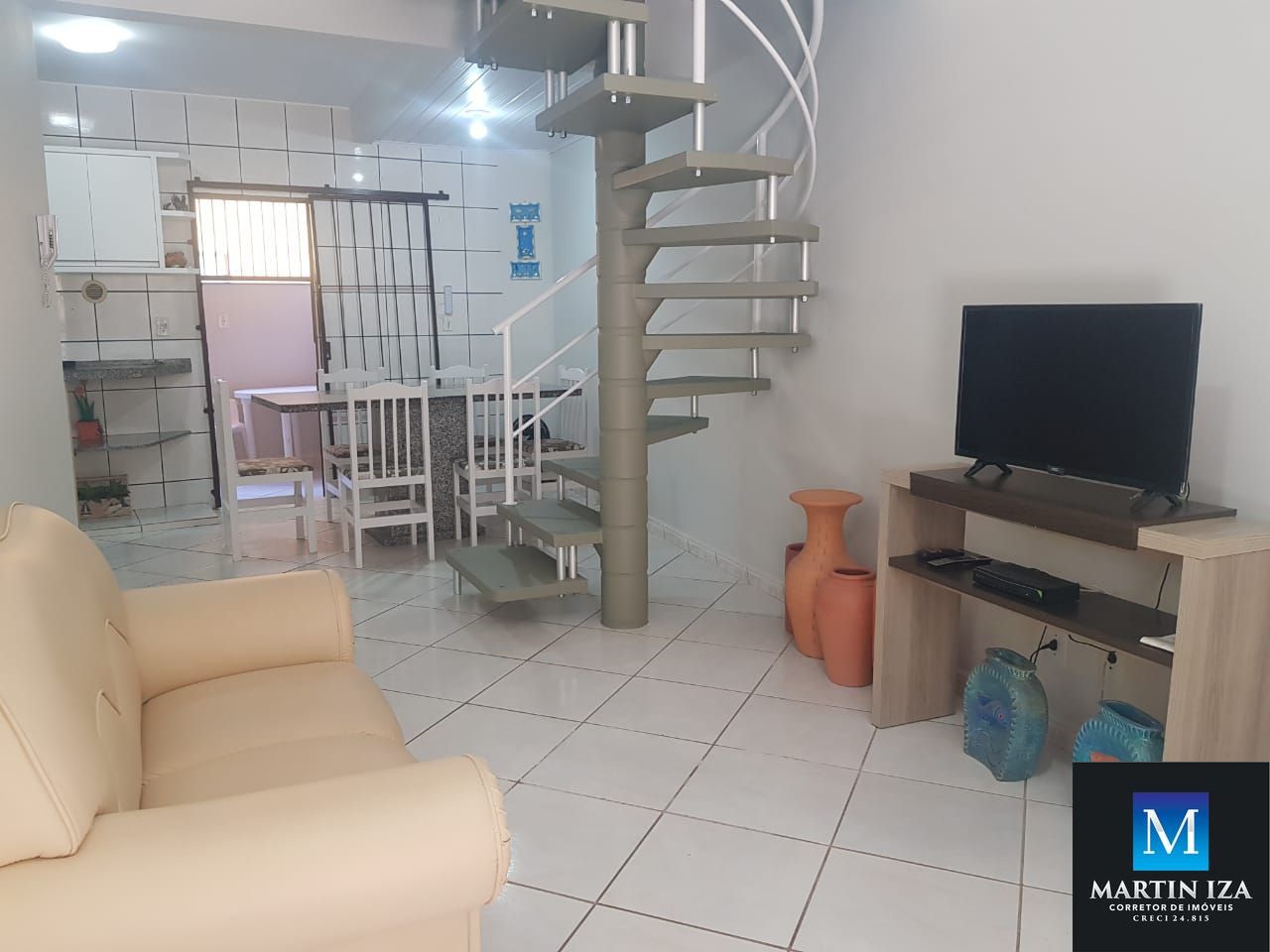 -Sala de estar/ jantar com TV, ventilador de teto, sofá e mesa para 6 pessoas.